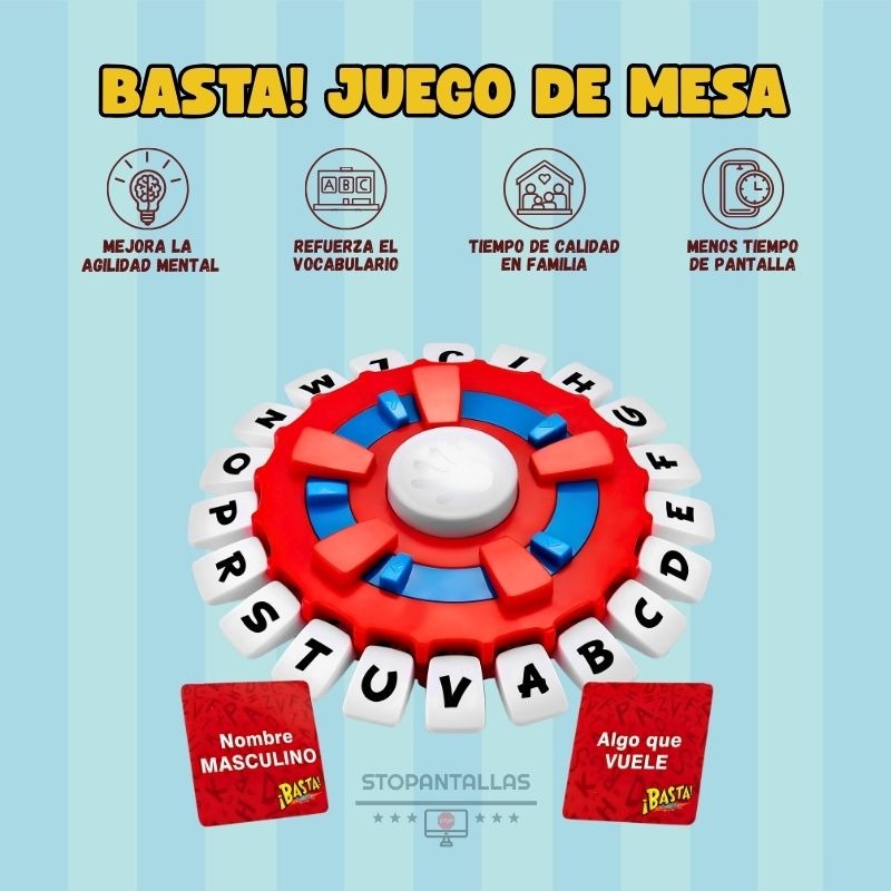 ¡BASTA! es el juego perfecto para activar tu mente y pasar momentos inolvidables con amigos o en familia. Elige una letra, responde categorías antes que todos y grita ¡BASTA! para detener la ronda. Su nuevo diseño con ruleta lo hace aún más dinámico y rápido.